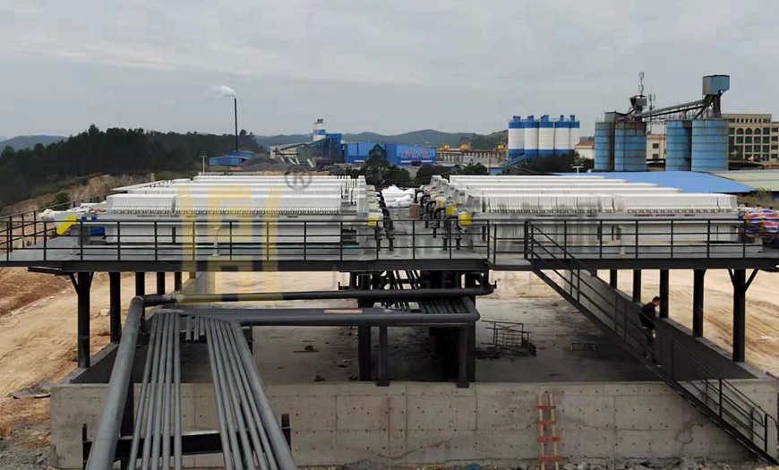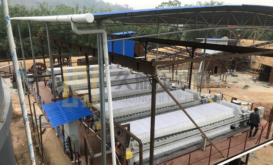 洗砂石骨料線上振動篩上加水(根據現場泥量添加),每小時產生洗砂污水總量,污水和少量細砂骨料經管道進入螺旋洗砂機,細砂骨料經過螺旋洗砂機頂部直接排放到輸送帶上進行干堆,洗砂機底部污水直接流入緩沖罐,用渣漿泵通過旋流器,底部進行細砂和污泥分離,細砂直接排放到細砂回收機振動篩上進行干堆,污水經過旋流器頂部通過提升泵直接進入預處理高效濃縮罐,通過加少量PAM聚丙烯酰胺藥劑/PAC組濾劑進行污泥沉降。清水直接排放到清水池,清水回收洗砂循環使用,預處理濃縮罐沉降污泥池底部通過渣漿泵把加藥沉降含40%-50%污泥,用渣漿泵進入污泥高壓壓濾機進行脫水;使污泥濾餅含水率達20-22%左右干污泥干堆/通過皮帶輸送機輸到指定地點。出水達到循環使用。無噪聲無異味,對周圍環境無影響。