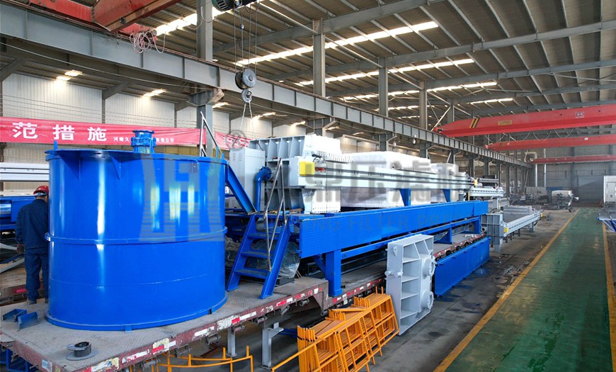 該機型由壓濾機,皮帶輸送機、入料泵、混合攪拌罐、操作平臺、雨棚等組成,泥漿在混合攪拌罐中與石灰或絮凝劑混合后由入料泵輸送至壓濾機內,在專用濾布的作用下對泥漿進行分離,形成泥餅和清水。